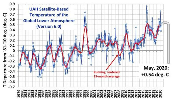 The latest global average temperatures of the troposphere updated to May 2020 - observed from US National Oceanic and Atmospheric Administration satellites – are computed by the University of Alabama at Huntsville in the United States. The data shows variations from the 30 year period 1981-2010.