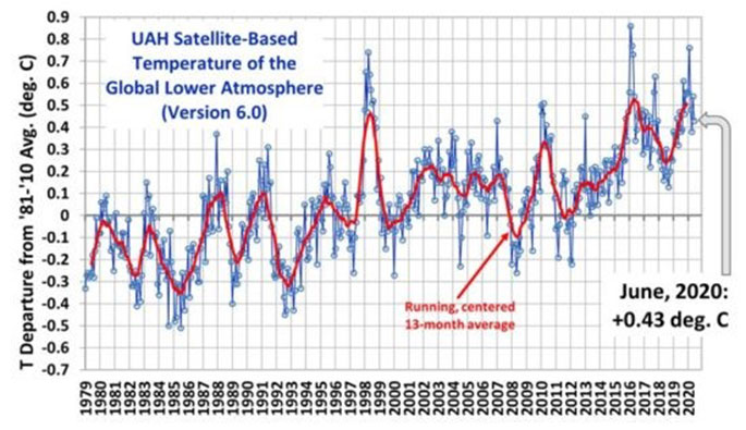 The latest global average temperatures of the troposphere updated to June 2020 - observed from US National Oceanic and Atmospheric Administration satellites – are computed by the University of Alabama at Huntsville in the United States. The data shows variations from the 30 year period 1981-2010.