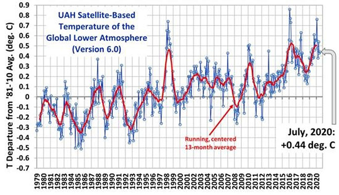 The latest global average temperatures of the troposphere updated to July 2020 - observed from US National Oceanic and Atmospheric Administration satellites – are computed by the University of Alabama at Huntsville in the United States. The data shows variations from the 30 year period 1981-2010.
