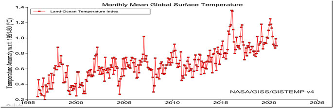 The graph shows the monthly mean global surface temperature anomaly from the base period 1951-1980, for the period 1996-October 2020.