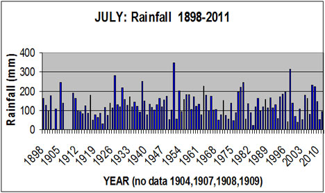 The graph of the July rainfall shows ‘normal' variations from year to year. There is a very small decrease in the overall July rainfalls during the last 50 years (1961-2010) from an average of 127mm, compared with an average of 132mm during the 50 years from 1911-1960. This is similar to the months of January, February, April, May, and June during the same periods, which also show small decreases in the overall rainfalls during the last 100 years, compared with a small increase in the March rainfalls. Since 1898, there have been 12 July months with a rainfall of 200mm or more, but only two July months with rainfalls of 30mm or less. Interestingly, there have been two occasions in July when rainfalls of more that 200mm occurred in adjacent years (1979, 1978 and 2007, 2009).
