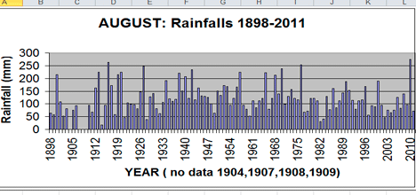 The graph of the July rainfall shows normal variations from year to year. There is a small decrease in the overall August rainfalls during the last 50 years (1961-2010) from an average of 121mm, compared with an average of 133mm during the 50 years from 1911-1960. This is similar to the months of January, February, April, May, June and July over the same periods, which also show small decreases in the overall rainfalls during the last 100 years, compared with a small increase in the March rainfalls.