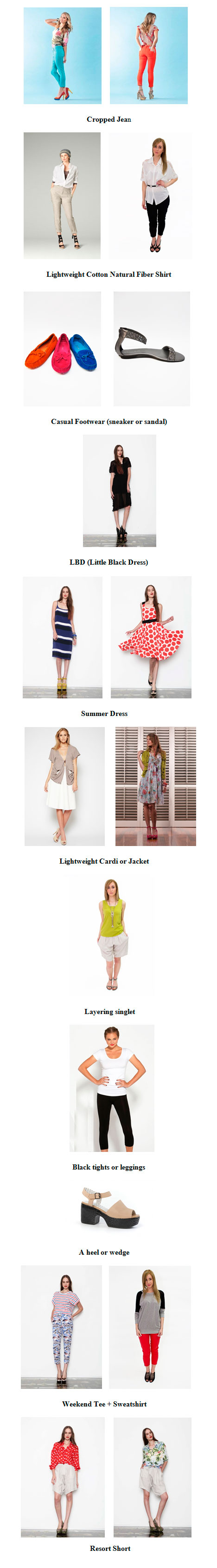 Now you have a collection that make up the bones of your wardrobe, so it's time to fill the gaps with those staple items that make every outfit work. Remember any original staples that you discard in your no pile will need replacing and you should always make this your priority. Every woman needs the following pieces to create the bones of any good wardrobe during summer: