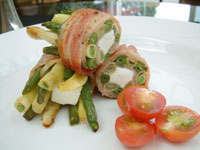 Trim the beans but leave them uncooked lay them out on top of the strip of bacon in colour sequence. Season well with salt and pepper then place a cube of feta in the middle and roll up. Drizzle with olive oil and bake in a moderate oven 180.c for fifteen minutes. serve simply as a snack or part of a main course.