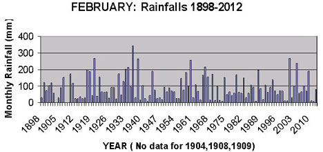 The graph of the February rainfalls (from 1898 to 2012) shows "normal" variations from year to year. By adding the February 2013 rainfall of 34mm does not change anything in the way of any significant change in the overall pattern of February rainfalls.