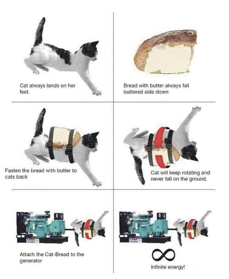 So assuming this is correct, Ben's concept should work. Attaching the bread to the cat creates a perpetual spinning motion machine, which can be connected to a generator for 'infinite energy”.