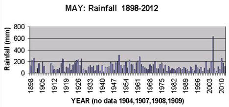Apart from the exceptional rainfall of 634mm in May 2005, the graph shows a small decrease in the overall May rainfalls in the last 50 years (1961-2010) from an average of 115mm, compared with an average of 126mm in the 50 years from 1911-1960.