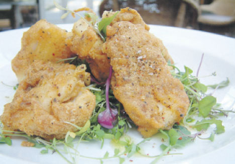 Clean and gut the calamari by removing the plastic y spine and skin. Score the inside of the calamari with the tip of a knife, and cut into bite-size pieces. Mix together peppercorns, red pepper powder, sea salt and the lemon zest. Now put half of this mix in a bowl with the corn flour, polenta, and baking soda. Toss the calamari pieces into this seasoned mix and coat well, then set aside. Mix a little water with the remaining flour mix to form a thickish batter then dip each piece of dusted calamari into the batter and fry in hot oil in a pot for about one minute or less. Depending on thickness of calamari it pays to test a piece out. Drain on absorbent paper and then sprinkle on the rest of the spice mix. Place on a pile of microgreens. Whisk together lemon juice and olive oil and drizzle over just before serving.