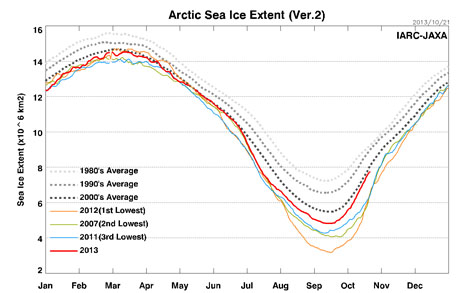 Date for the Arctic sea ice in the Northern Hemisphere summer shows that 2012 had lowest extent of the ice (in recent times), followed by 2007 (second), 2011 (third), and 2008 (fourth). However, for 2013 the Arctic ice sheet increased considerably and is now (October 2013) back to the levels of the first decade of 2000.
