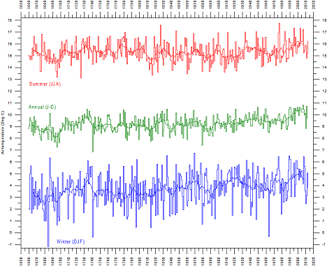 The graph below shows the central England surface air temperature series, which is the longest existing meteorological record. Thin lines show the annual values; and the thick lines show the running 11-year average. The graphs for the annual, summer and winter temperatures have been prepared using the composite monthly meteorological series, originally painstakingly homogenised and published by the late professor Gordon Manley in 1974. The data series is now updated by the UK's Hadley Centre, and has been updated this month (October 2013).