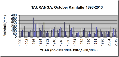 The below graph shows the range of Tauranga's October rainfalls, from an extreme high of 357 mm in 1916 to a low of only 7 mm in 1984.