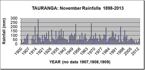 The graph shows the range of November rainfalls from 1898 to 2013 in Tauranga, from an extreme high of 285 mm in 1916 to a low of only 12 mm in 2009.