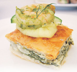 Cut the spanakopita into squares. Cover the top with a dollop of skordalia, then a slice of cucumber and the warm prawns. Press together and chill until required.