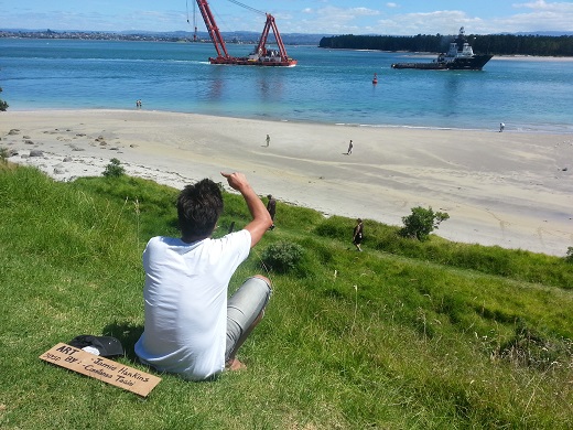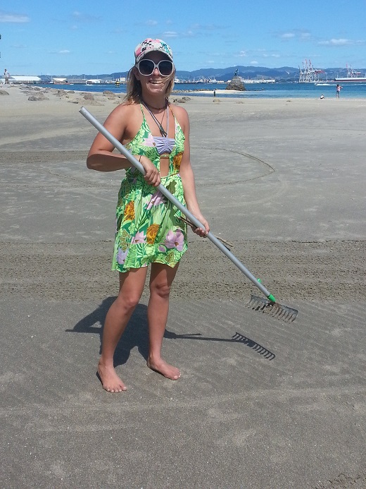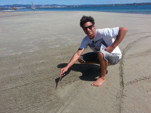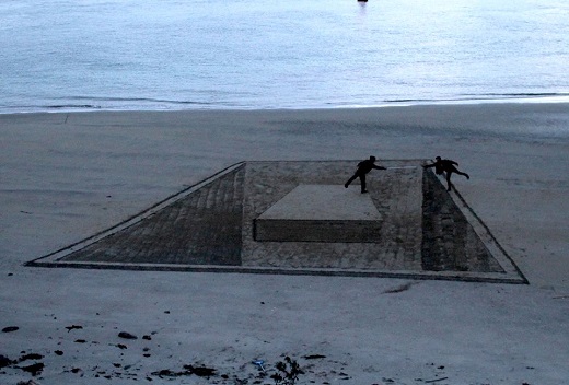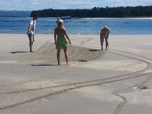 Their amazing anamorphic illusions have been quietly etched out on the sandy beach around the side of the Mount, opposite Matakana Island, delighting passersby.