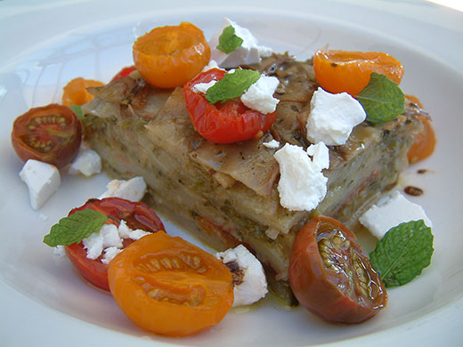 Bake at 150 degrees Celsius for four hours. Remove from the oven and test to see if all layers are cooked right through. Serve warm, or cold once its set. Garnish with semi-dried cherry tomatoes and crumbles of feta.