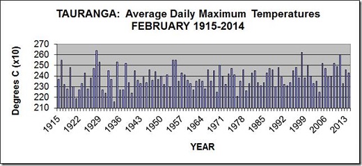 The graph shows details of the average daily maximum temperatures (called simply ‘afternoon'), for Tauranga for February from 1915-2014.