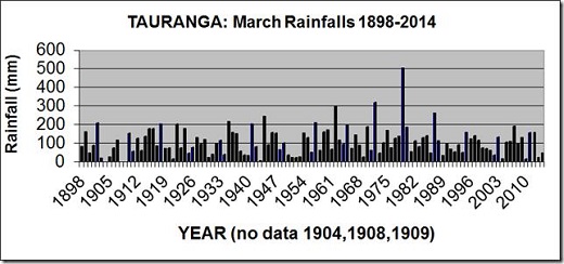 Rainfalls for the month of March have been recorded in Tauranga since 1898 – except for 1904, 1908 and 1909.