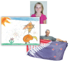 As promised, here's some fine flag ideas from our readers. Winner of the prizes are Deaana Roberts, age seven, for her very cool entry, and the wildest Kiwi we've ever seen.