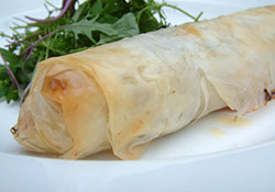 Carefully roll the whole thing into a cylinder. Remember to work quickly with the filo and brush well with butter, so it doesn't dry out.