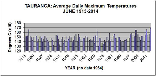 The graph shows details of the average daily maximum temperatures, called simply ‘afternoon', for Tauranga for June from 1913-2014.