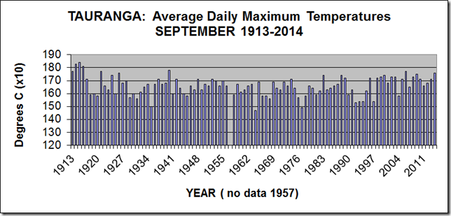The graph shows details of the average daily maximum temperatures (simply called 'afternoon”) for Tauranga for September from 1913-2013.