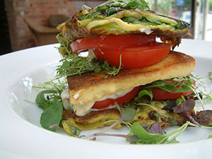 When all nice and cooked drain on kitchen towel and assemble using the fritters as a base. Adding the fried paneer cheese, sliced tomatoes, basil leaves, mayonnaise or aioli, and microgreens.