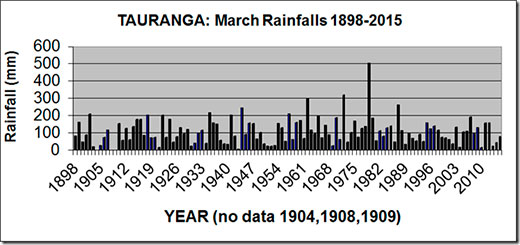 Rainfalls for the month of March have been recorded in Tauranga since 1898 – except for 1904, 1908 and 1909.