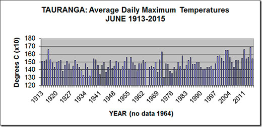 The graph shows details of the average daily maximum temperatures, called simply ‘afternoon', for Tauranga for June from 1913-2015.