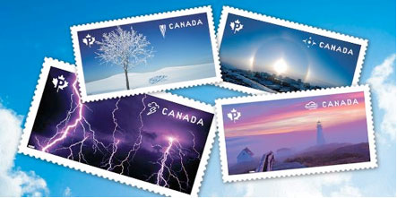 On July 1 (Canada Day) Canada Post unveiled five new stamps designed to showcase one of Canadians' most popular topics: the weather. The five stamps, issued to coincide with the 175th anniversary of continuous weather observing in Canada, feature weather phenomena in all their photographic splendour.