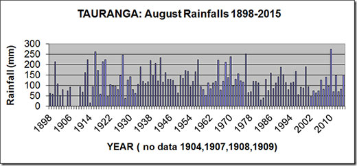 Rainfalls for the month of August have been recorded in Tauranga since 1898, except for 1904, 1907, 1908 and 1909.