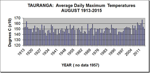 The graph shows details of the average daily maximum temperatures, called simply ‘afternoon' for Tauranga for August from 1913-2015. The average for August 2015 was 15.0 degrees Celsius.