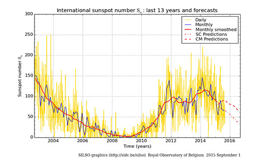 The maximum of solar cycle 24 was reached in April 2014, with a maximum of the 13-month smoothed sunspot number at 81.8. Since then, solar activity has steadily declined (the monthly mean sunspot number is now around 50).