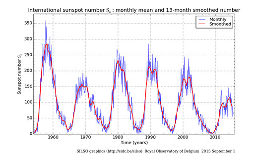 The NASA Solar Physics website ( and other web sites such as the Royal Observatory of Belgium) includes information on sunspot numbers, the ‘Maunder Minimum', and sunspot cycle predictions. The sunspot index is updated monthly and available from 1749. The last time the monthly sunspot number was above 100 for any significant period of time was September 2002 when the value was 109.6, and the last time the value was above 200 was in August 1990 when the value was 200.3.
