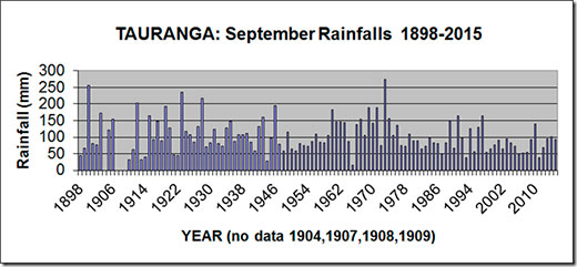 Rainfall for the month of September have been recorded in Tauranga since 1898, except for 1904, 1907, 1908, and 1909.
