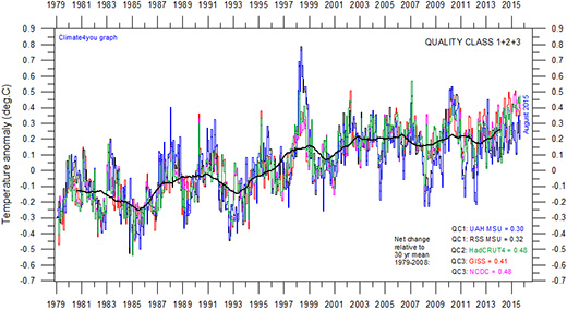A superimposed plot of Quality Class 1 and Quality Class 2 and Quality Class 3 global monthly temperature estimates. As the base period differs for the different temperature estimates, they have all been normalised by comparing to the average value of 30 years from January 1979 to December 2008. The heavy black line represents the simple running 37 month mean of the average of all temperature records.