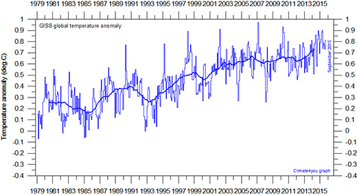 One of several key global temperature graphs is the monthly average surface air temperature calculated by the Goddard Institute for Space Studies, at Columbia University, New York City, USA. The graph is updated to September 2015. GISS is a laboratory of the Earth-Sun Exploration Division of NASA's Goddard Space Flight Center and a unit of the Columbia University Earth Institute. The thick line is the simple running 37 month average, nearly corresponding to a running 3 year average