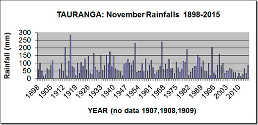 The graph shows the range of November rainfalls from 1898 to 2015 in Tauranga, from an extreme high of 285 mm in 1916 to a low of only 12 mm in 2009.