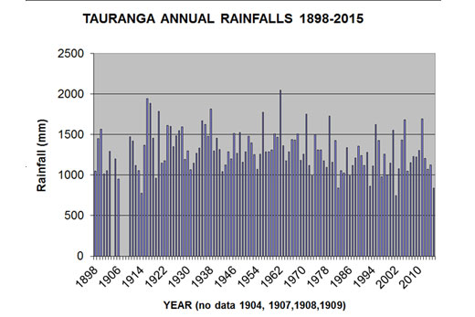 The average rainfall in Tauranga for the 50 years 1911-60 was 1365 mm, compared with the average rainfall for the 50 years 1961-2010 of 1263 mm.