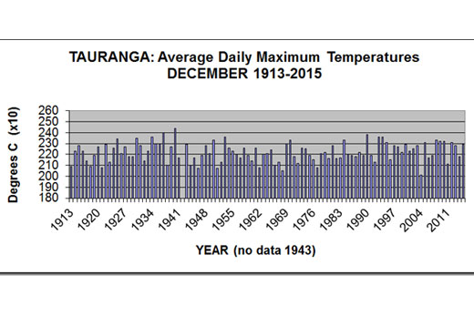 The graph below shows details of the average daily maximum temperatures, called simply ‘afternoon', for Tauranga for December from 1913-2015.