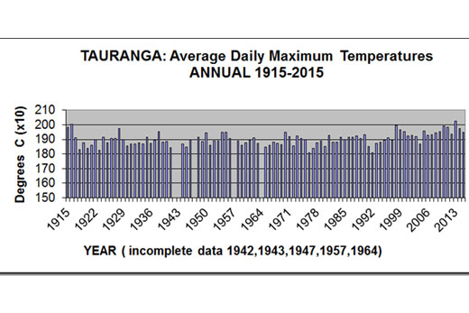 The graph below shows details of the average annual daily maximum temperatures (called simply 'afternoon'), for Tauranga for the years 1914-2015.