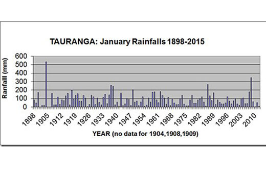 The graph shows the range of Tauranga's January rainfalls from 1898-2015, varied from an extreme high of 532 mm in 1907 to a low of only 1 mm in 1928.