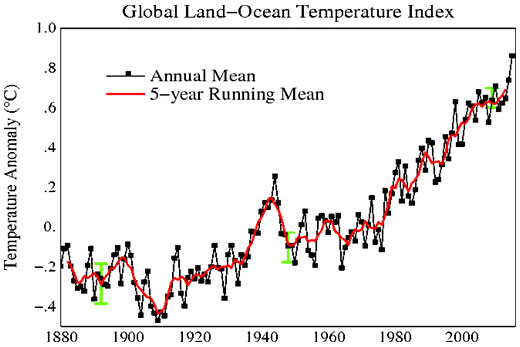 A graph of the global temperatures (for the land/ocean) from 1880 to 2015, show a general warming from 1910 to the early 1940's, a cooling from the early 1940's to the mid-1970's; a general warming from the mid-1970's to about 1998; a stable period of temperatures until about the 2010, and a warming from 2011.
