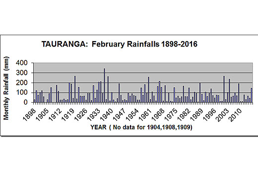 Rainfalls for the month of February have been recorded in Tauranga since 1898 (except for 1904, 1908, and 1909).