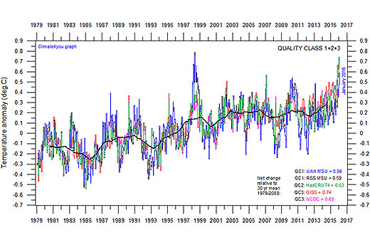 A graph of five global monthly temperatures January 1979 to January/February 2016 is shown below.