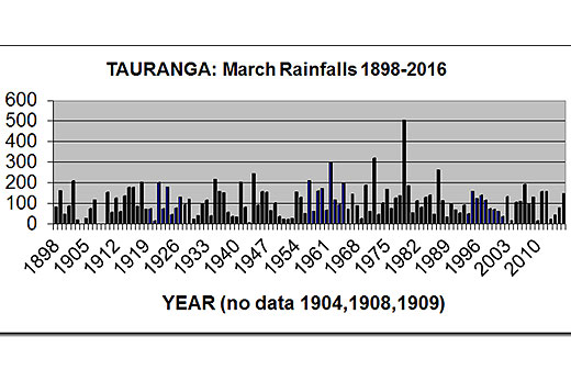Rainfalls for the month of March have been recorded in Tauranga since 1898 – except for 1904, 1908 and 1909.