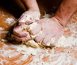 Roll out onto floured board into a rectangle. Next, flour surface of pasta and, using both hands, roll rectangle into a Swiss roll shape. Use a sharp knife to cut into desired thickness. For example, tagliarini (thin), tagliatelle (medium) or parpadelle (thick).