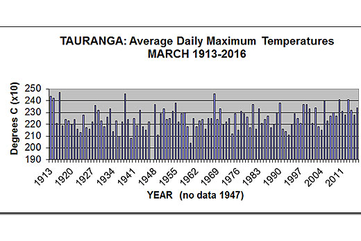 The graph shows details of the average daily maximum temperatures, called simply ‘afternoon', for Tauranga for the months of March from 1913-2016.