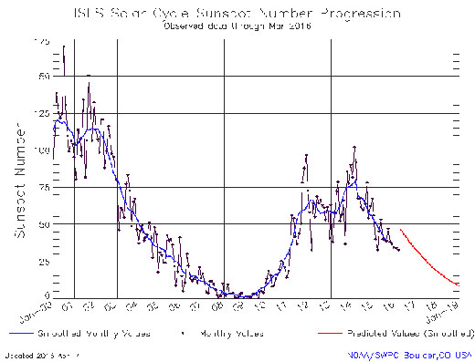 The maximum of Solar Cycle 24 was reached in April 2014, with a maximum of the 13-month smoothed sunspot number at 81.8. Since then, solar activity has steadily declined (the monthly mean sunspot number is now around 30).