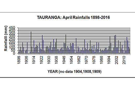 In contrast, the rainfalls in Tauranga for April 2015 (116 mm), and April 2016 (87 mm) were about average.