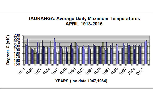 The graph shows details of the average daily maximum temperatures (called simply ‘afternoon'), for Tauranga for April from 1913-2016. Note April 1947 and 1964 are not included because of incomplete data.